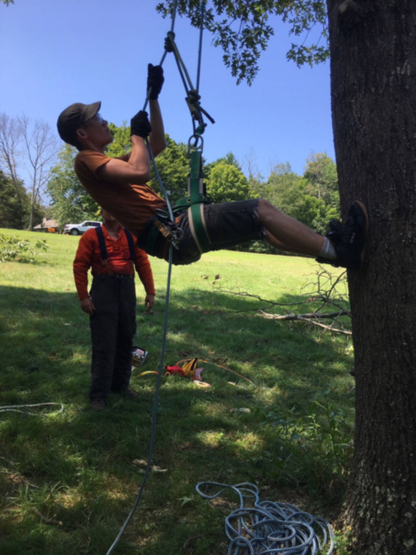 Here, veteran Douglas Barton is teaching a student how to use a harness to trim